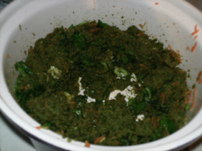 Here it is all blitzed up. This was half the batch. Mum did the other half separately then mixed it all up. I didn't like the noise of the blitzer at first, but I soon realised that scary whizzer noise meant food for me, so now I don't care at all.